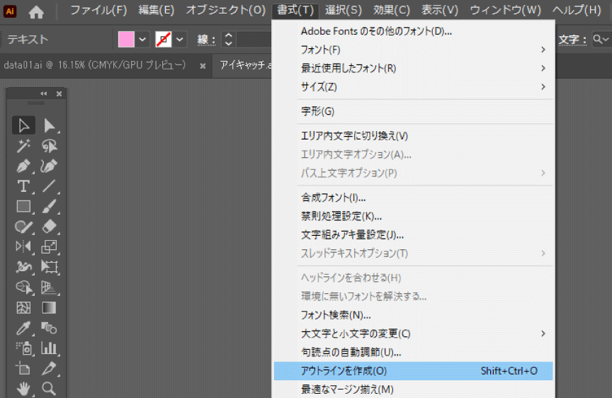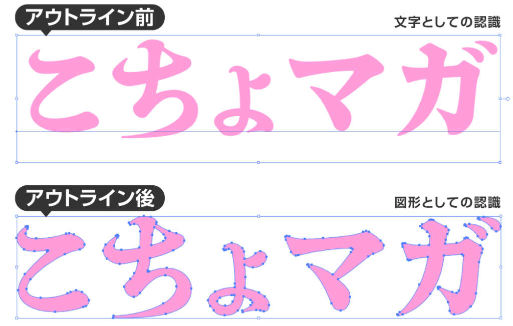 このようにアウトライン前の状態を「テキストデータ」、アウトライン後の状態を「パスデータ」と言います。アウトライン化をしていないデータは、フォントを持っている人でないと文字が正しく表示されません。
