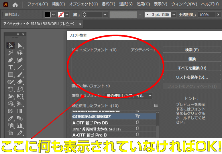 上記の操作で入稿前に、アウトラインの漏れが本当に無いかを確認しておきましょう。赤〇の部分に何も表示されていなければ、完了となります。